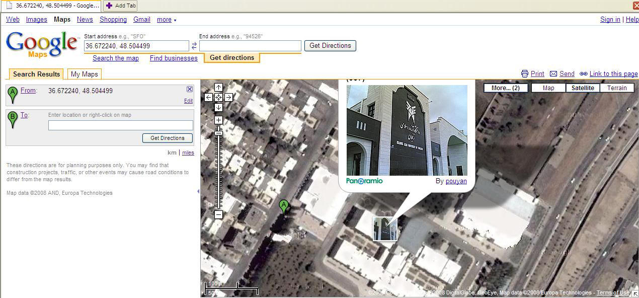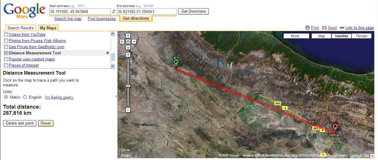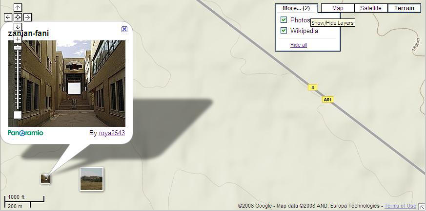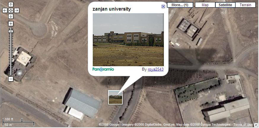 بالاخره تصاویر با وضوح تصویر نسبتاً بالا از شهر زنجان هم بر روی نت قرار گرفت. سایت http://maps.google.com تصاویر ماهواره ای مناطق مختلف رو به سرعت داره کامل می کنه و تصاویر با وضوح تصویر بالاتر رو جایگزین تصاویر قبلی میکنه. نکات جالب توجهی که در کنار تصاویر ماهواره ای در این سایت می شه مشاهده کرد، نمایش نقشه توپوگرافی منطقه با منحنی میزان های 20 متری (برابر با دقت منحنی میزان های نقشه های 1:25000 سازمان نقشه برداری)، نمایش عکسها از مناطق مختلف و مهم در هر منطقه، نمایش نقشه، اندازه گیری فاصله، ارائه مختصات، ارائه اطلاعات توصیفی با قدرت جستجوی Google و .... هستش. با یه کم بررسی میشه فهمید که این تصاویری که تازه منتشر شدن حداقل مال 3 سال پیش هستند.